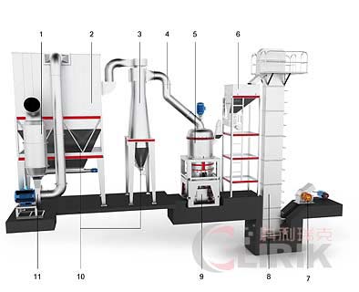 HGM8021中速微粉磨全套配置包括锤式破碎机、斗式提升机、储料仓、震动给料机、微粉磨主机、变频分级机、双联旋风集粉器、脉冲除尘系统、高压风机、空气压缩机、电器控制系统。